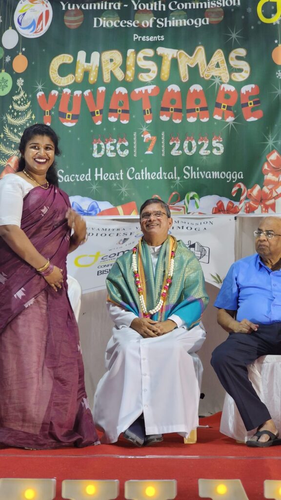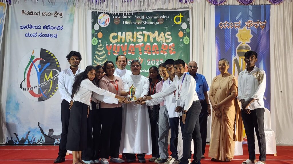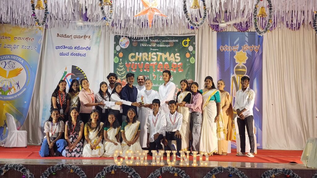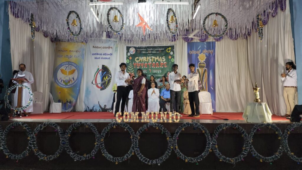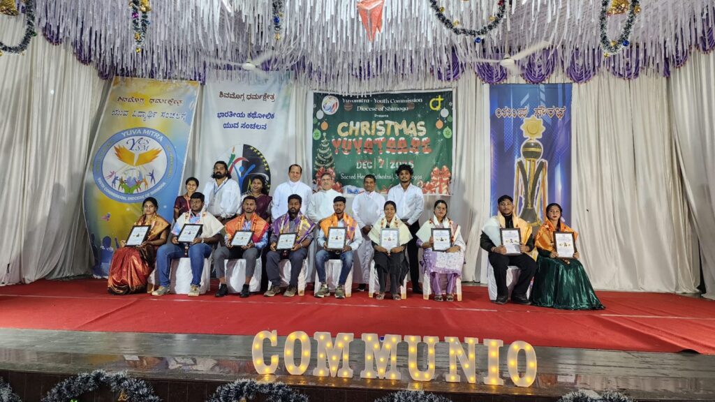 Shivamogga, December 8, 2025: On December 7, 2025, the Youth Commission of the Diocese of Shimoga, “Yuvamitra,” hosted Youth Christmas and the Yuvakeerthi Awards for the Diocese’s youth at the Sacred Heart Cathedral hall. The program commenced at 9:00 AM with an icebreaker session facilitated by Sannidhi, ICYM President of Sacred Heart Cathedral, Shivamogga, and their team.