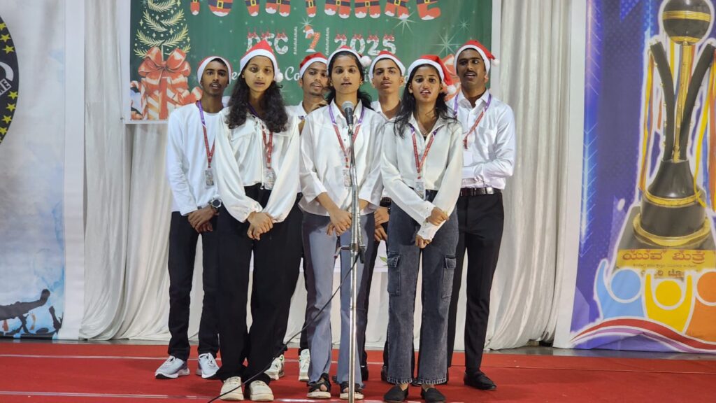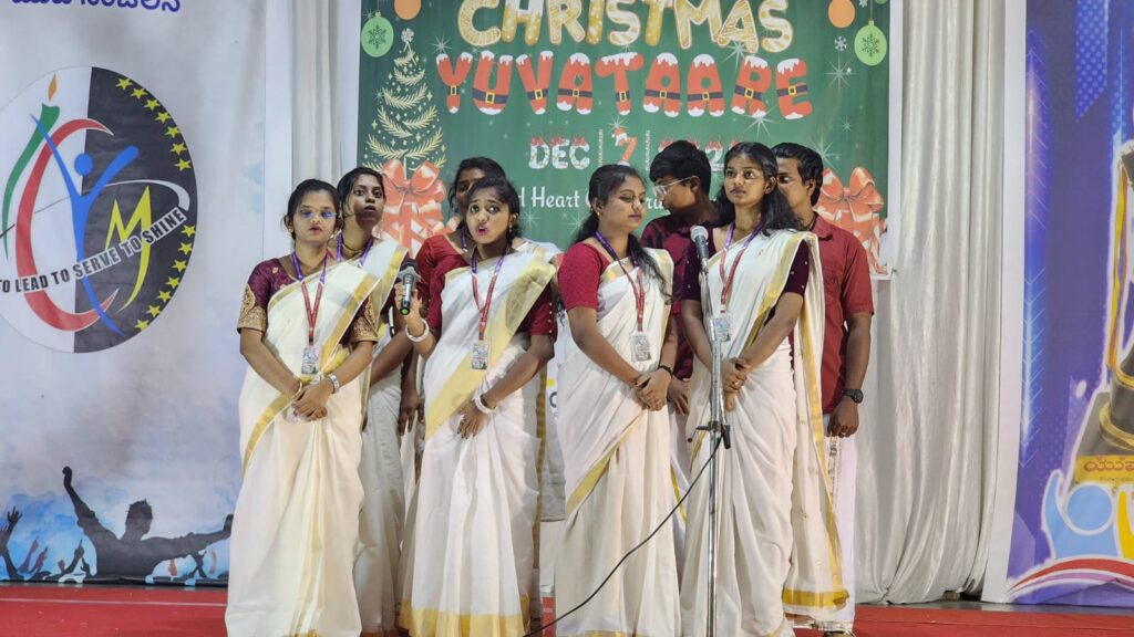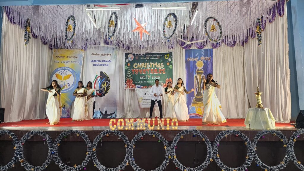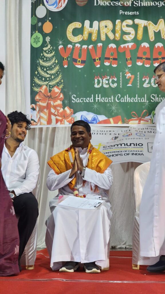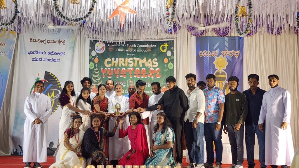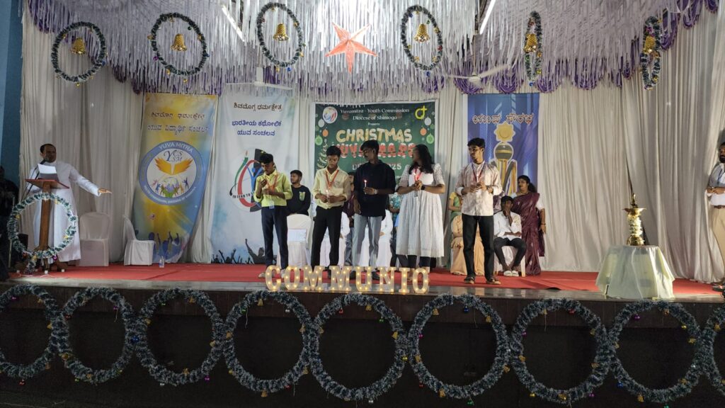 Shivamogga, December 8, 2025: On December 7, 2025, the Youth Commission of the Diocese of Shimoga, “Yuvamitra,” hosted Youth Christmas and the Yuvakeerthi Awards for the Diocese’s youth at the Sacred Heart Cathedral hall. The program commenced at 9:00 AM with an icebreaker session facilitated by Sannidhi, ICYM President of Sacred Heart Cathedral, Shivamogga, and their team.